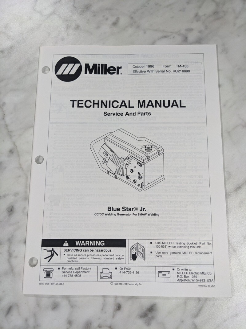 Miller Welder Techinical Service Manual Parts List Book Blue Star Jr Tm-438 1996