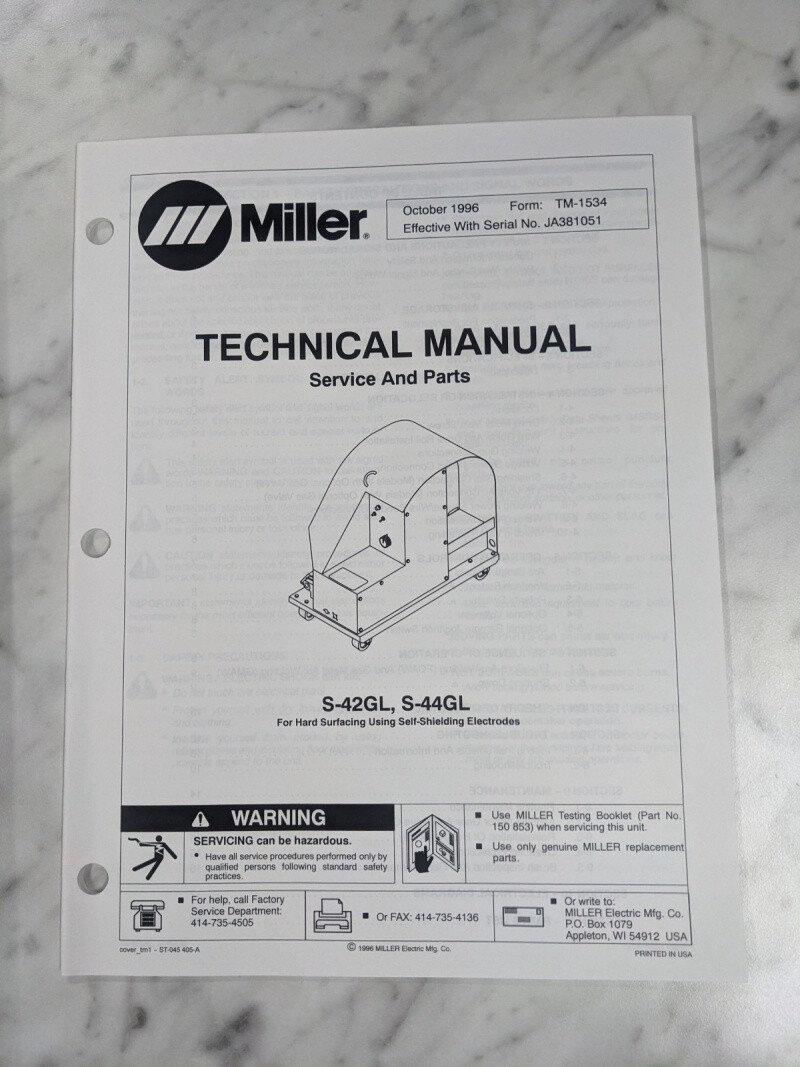 Miller Welder Techinical Service Manual Parts List S-42Gl S-44Gl Tm-1534 1996