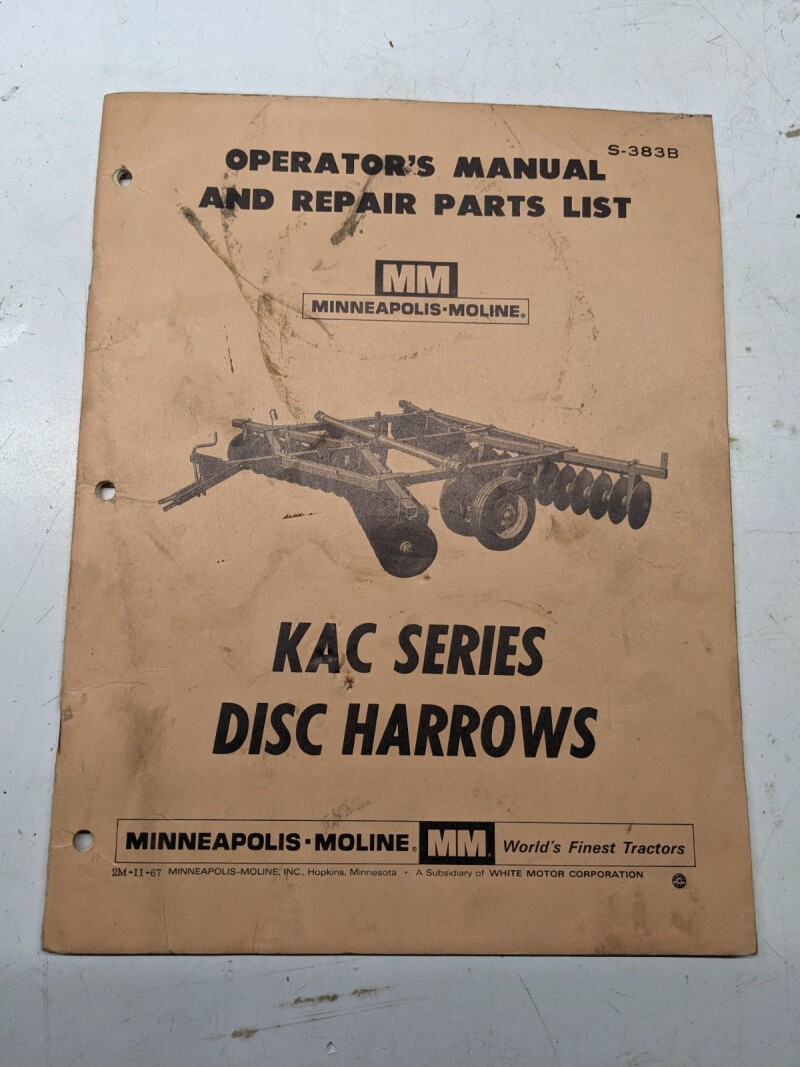 Minneapolis Moline Mm Operator Manual Repair Parts List Kac Disc Harrows S-383B