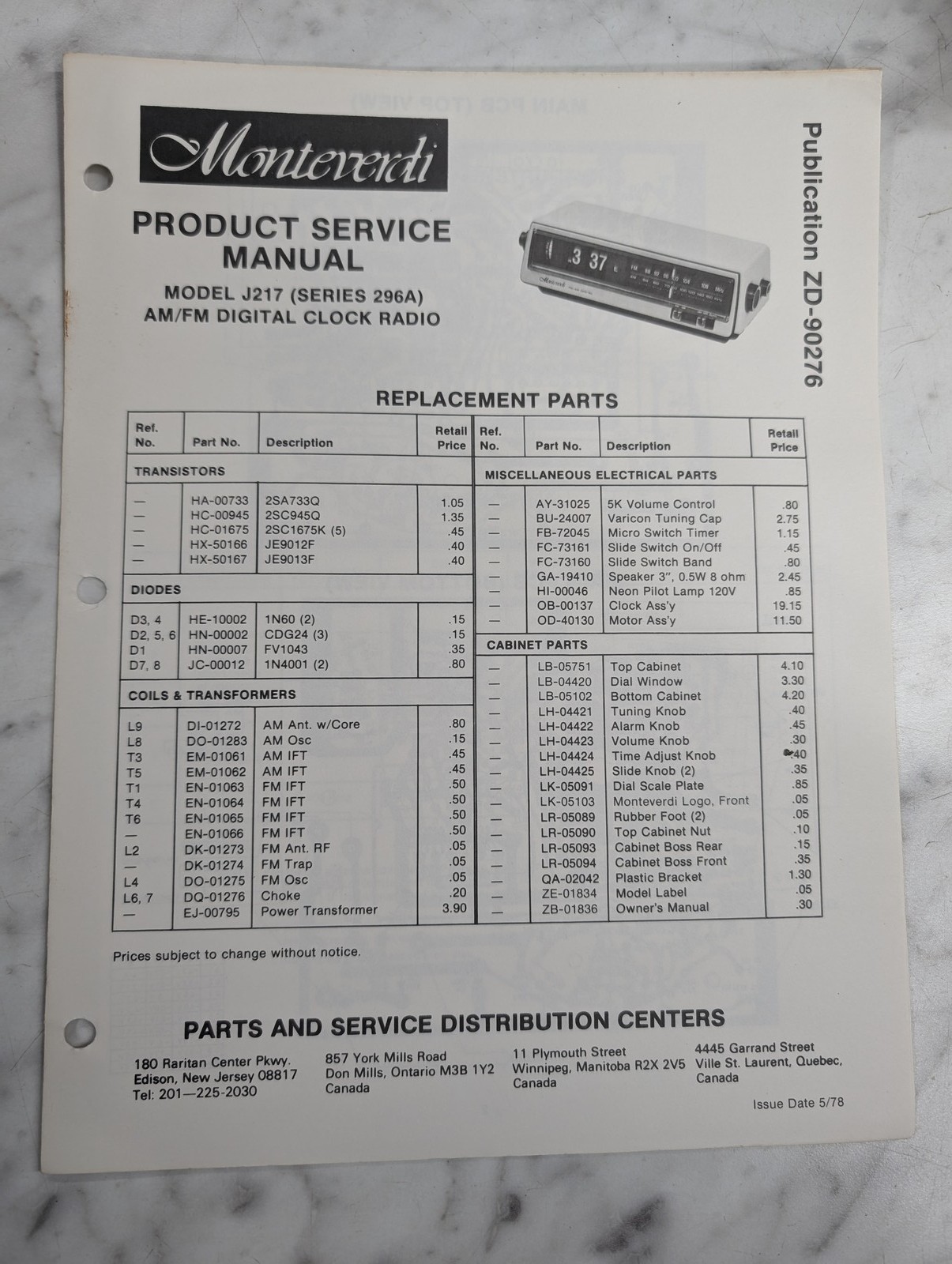 Monteverdi Service Manual Repair Parts List Radio Digital Clock J217 296A 1978
