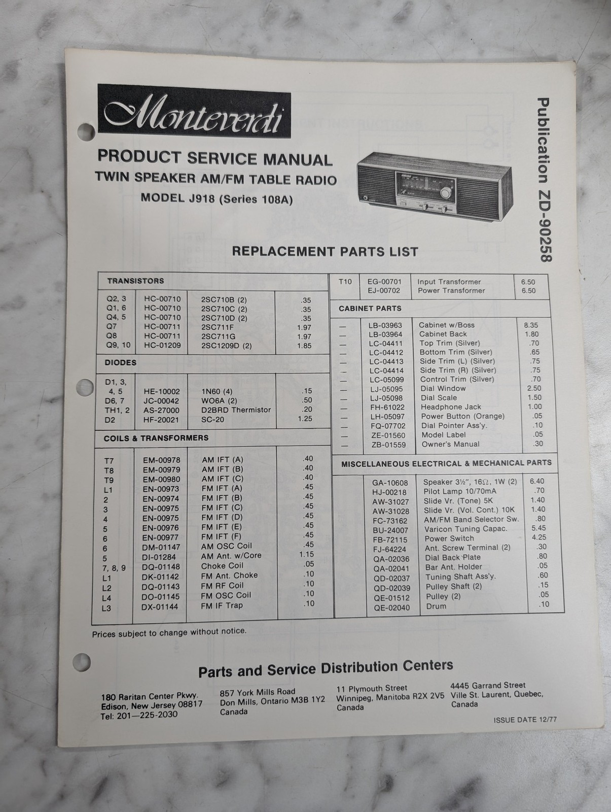 Monteverdi Service Manual Repair Parts List Radio Stereo Table J918 108A 1977