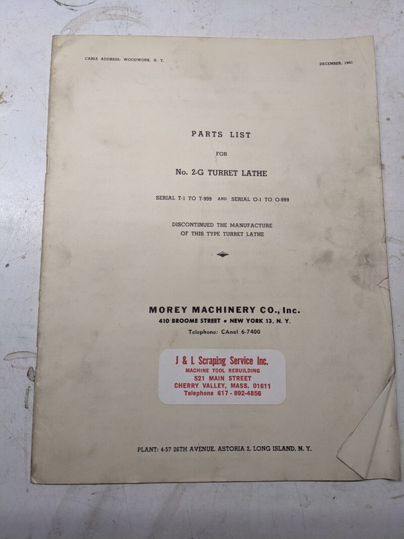 Morey Machinery Service Parts List Book Manual 2G Turret Lathe Machine 1941