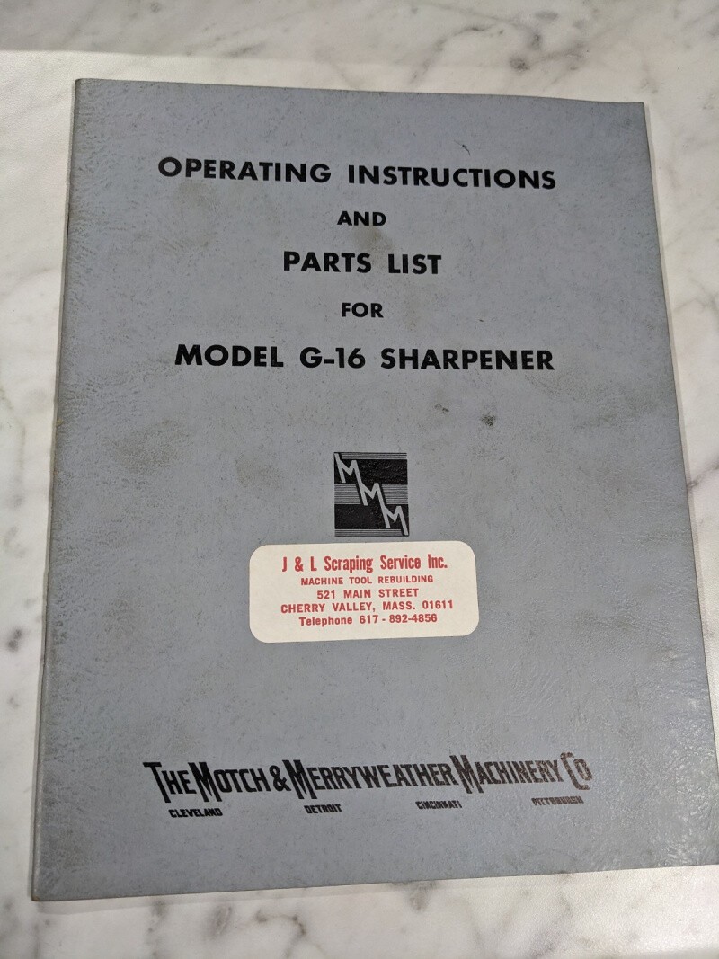 Motch Merryweather Operator Manual Parts List Book Model G-16 Sharpener