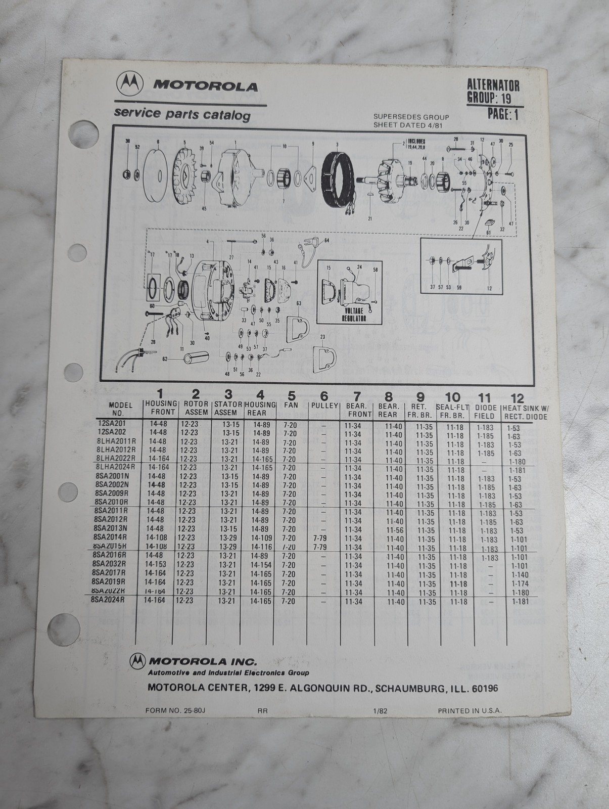 Motorola Service Parts Catalog Book List Manual Alternator Group 19 1981
