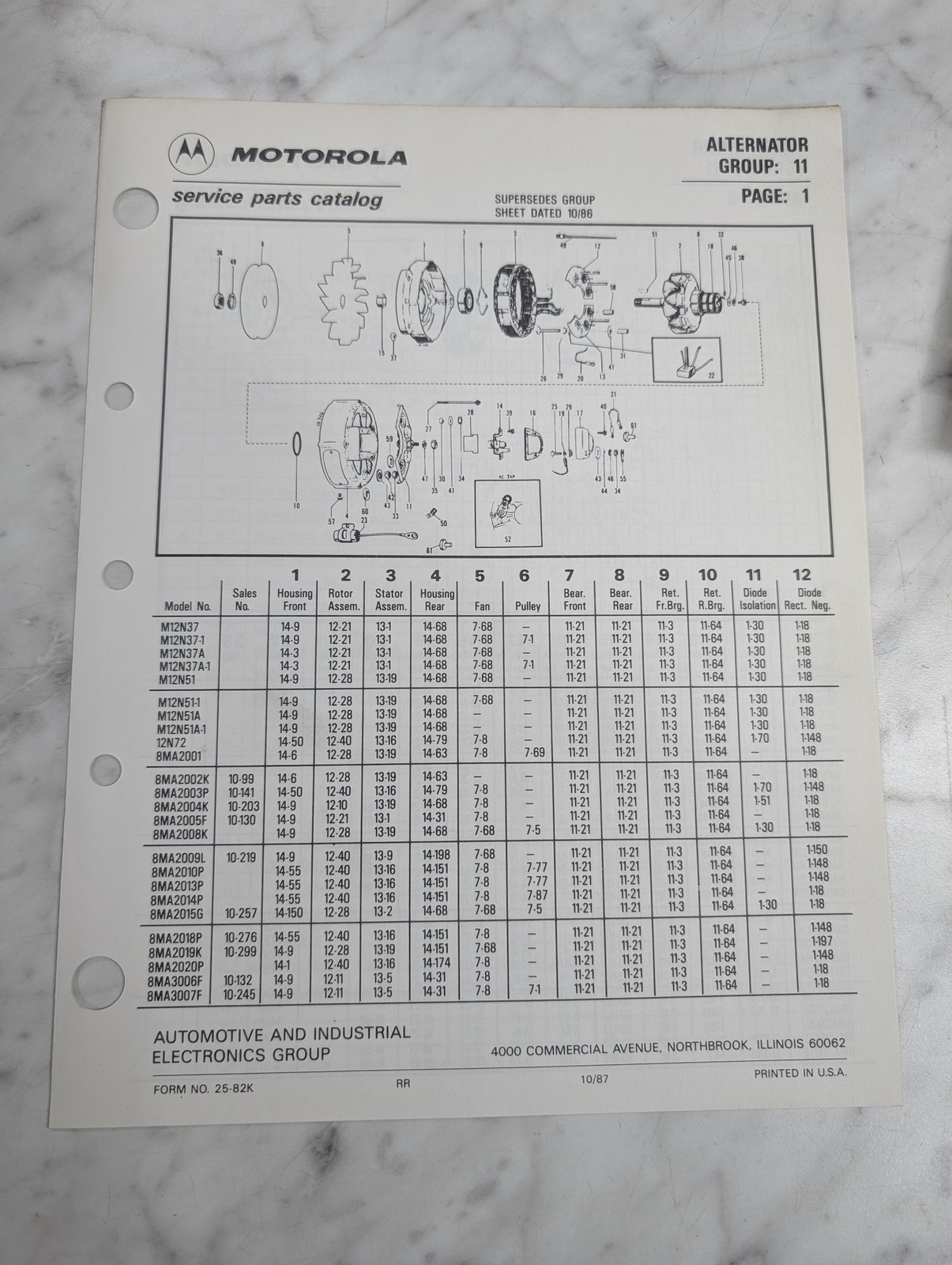 Motorola Service Repair Parts Catalog List Book Manual Alternator Group 11 1987