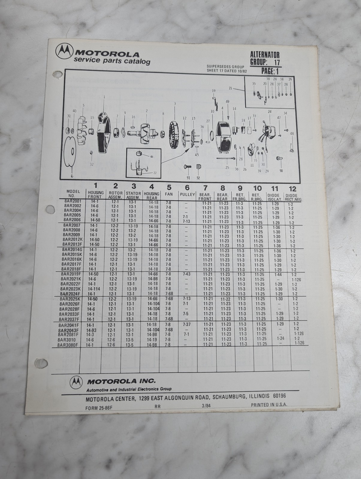 Motorola Service Repair Parts Catalog List Book Manual Alternator Group 17 1984
