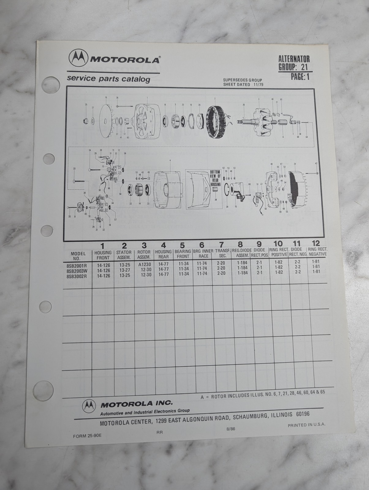 Motorola Service Repair Parts Catalog List Book Manual Alternator Group 21 1986