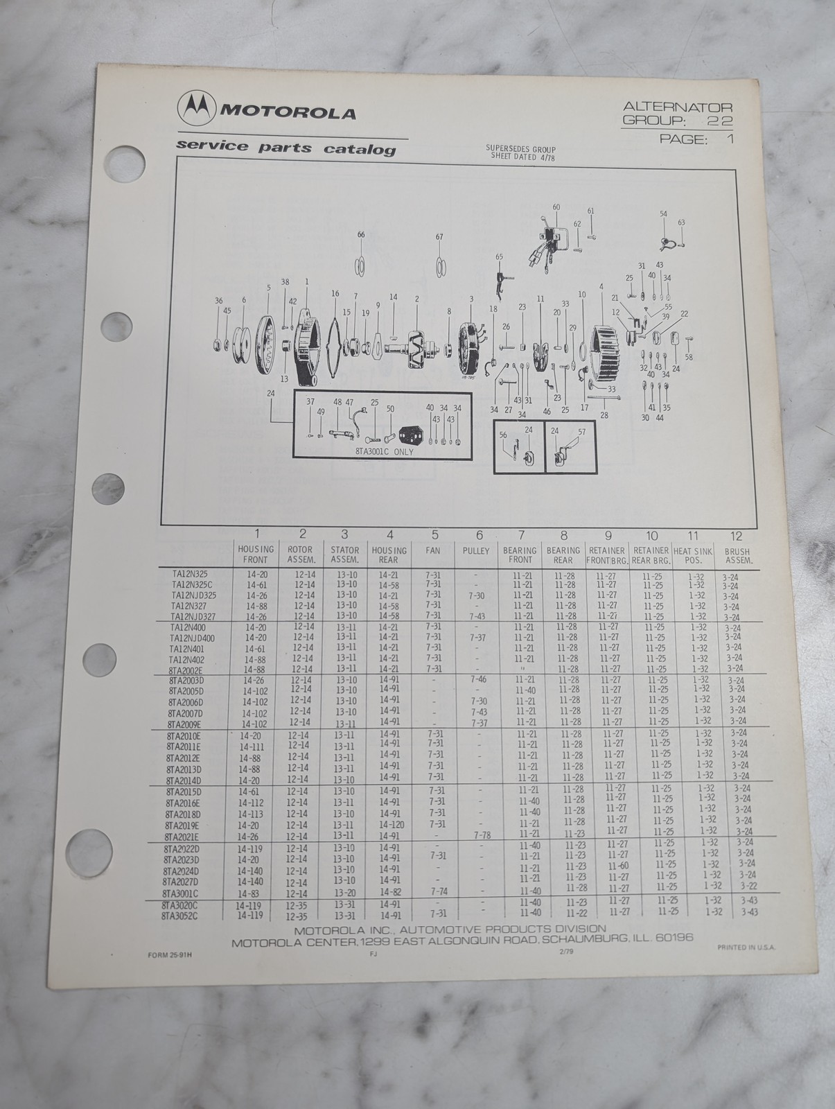 Motorola Service Repair Parts Catalog List Book Manual Alternator Group 22 1979