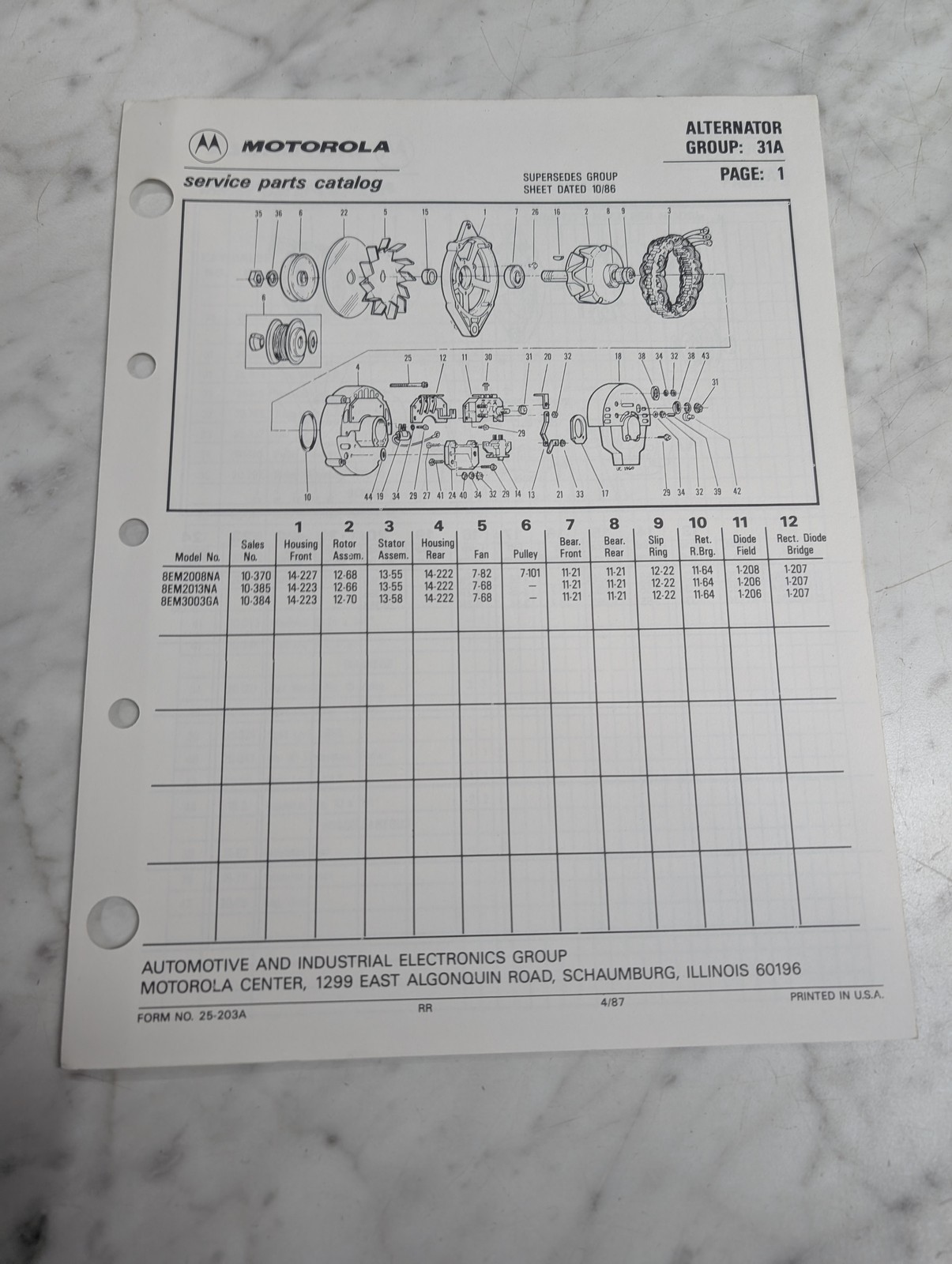 Motorola Service Repair Parts Catalog List Book Manual Alternator Group 31A 1987