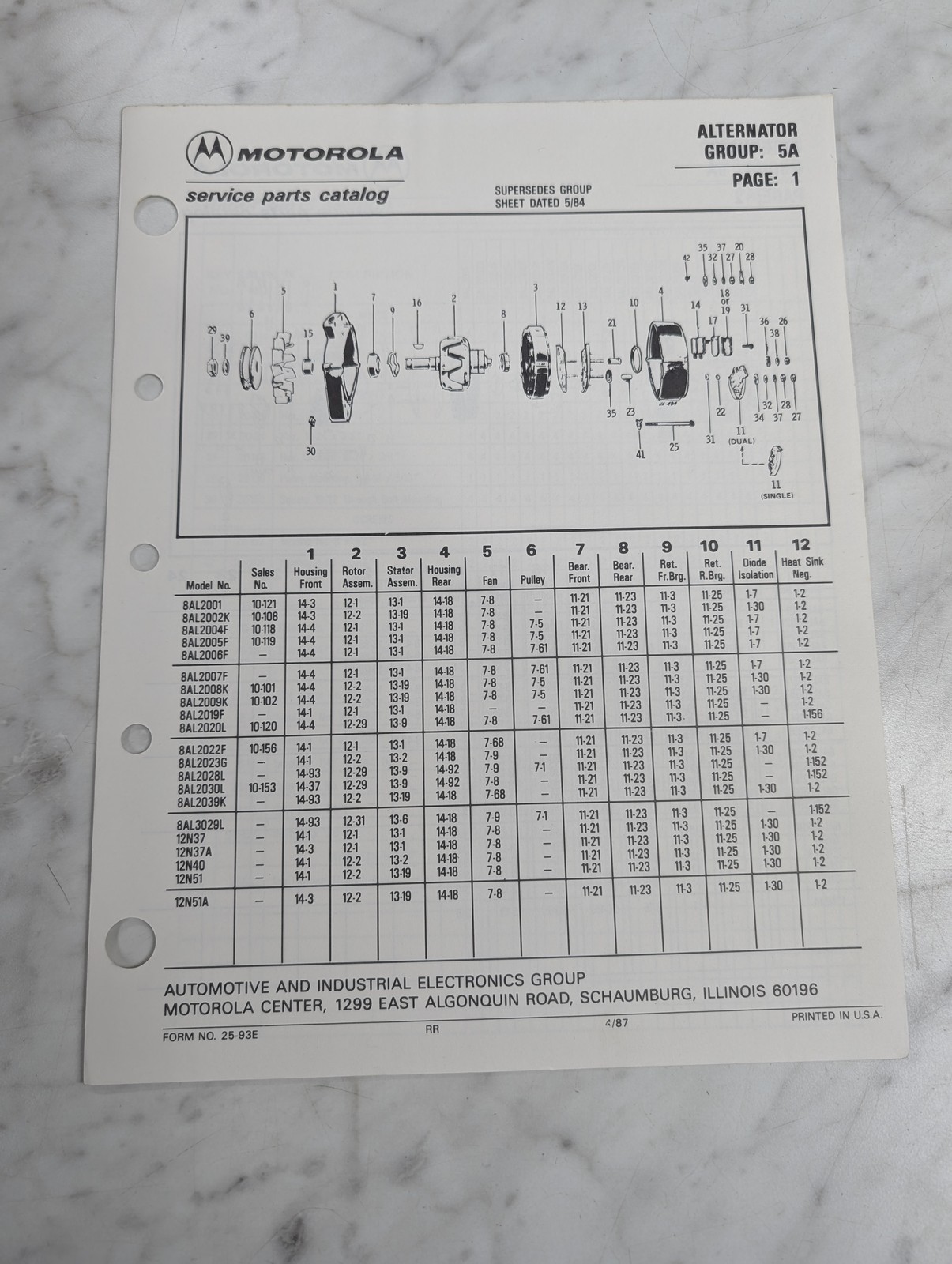 Motorola Service Repair Parts Catalog List Book Manual Alternator Group 5A 1987