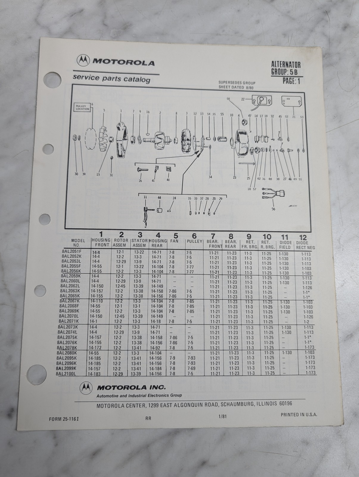 Motorola Service Repair Parts Catalog List Book Manual Alternator Group 5B 1981