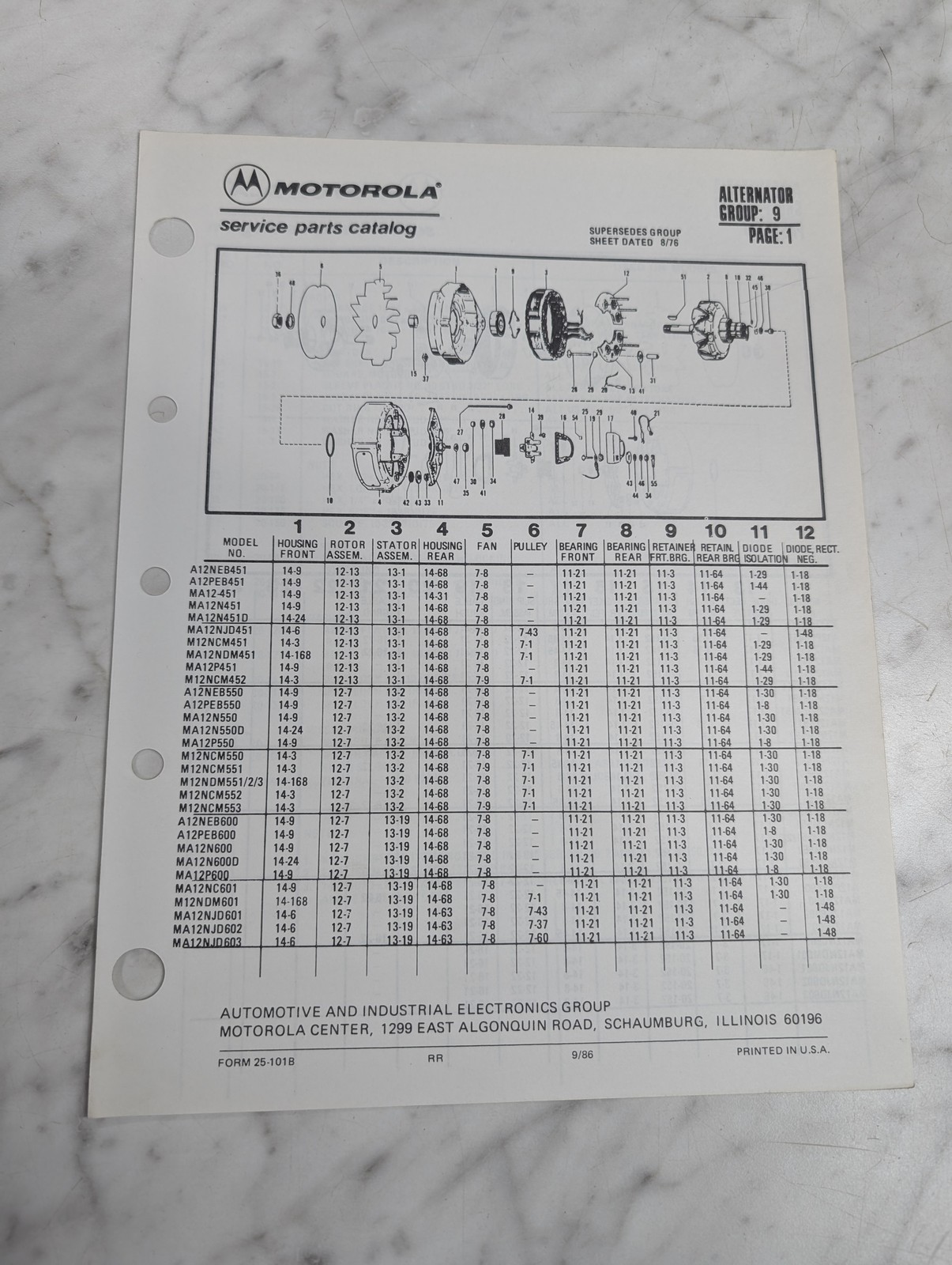 Motorola Service Repair Parts Catalog List Book Manual Alternator Group 9 1986