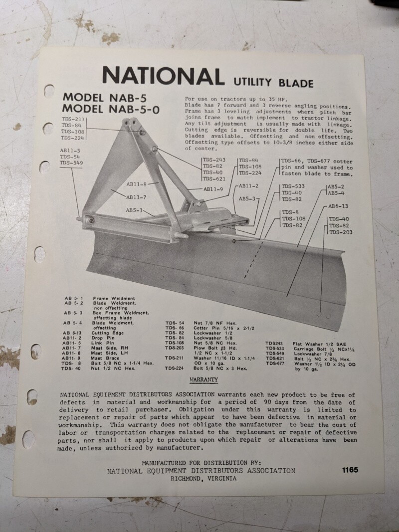 Nab-5-0 National Utility Blade Model 1165 Parts List & Rake Accessory Tractor