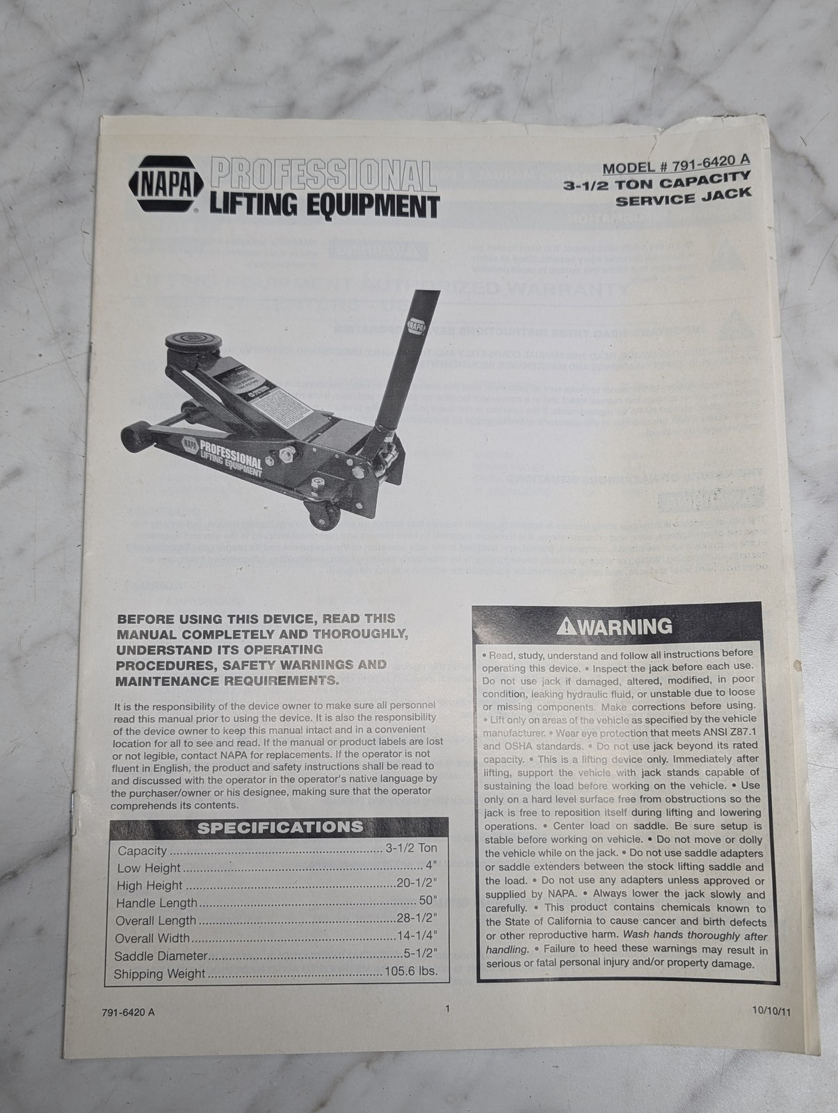 Napa Professional Lifting Equipment Model 791-6420 A Service Jack Manual Guide B