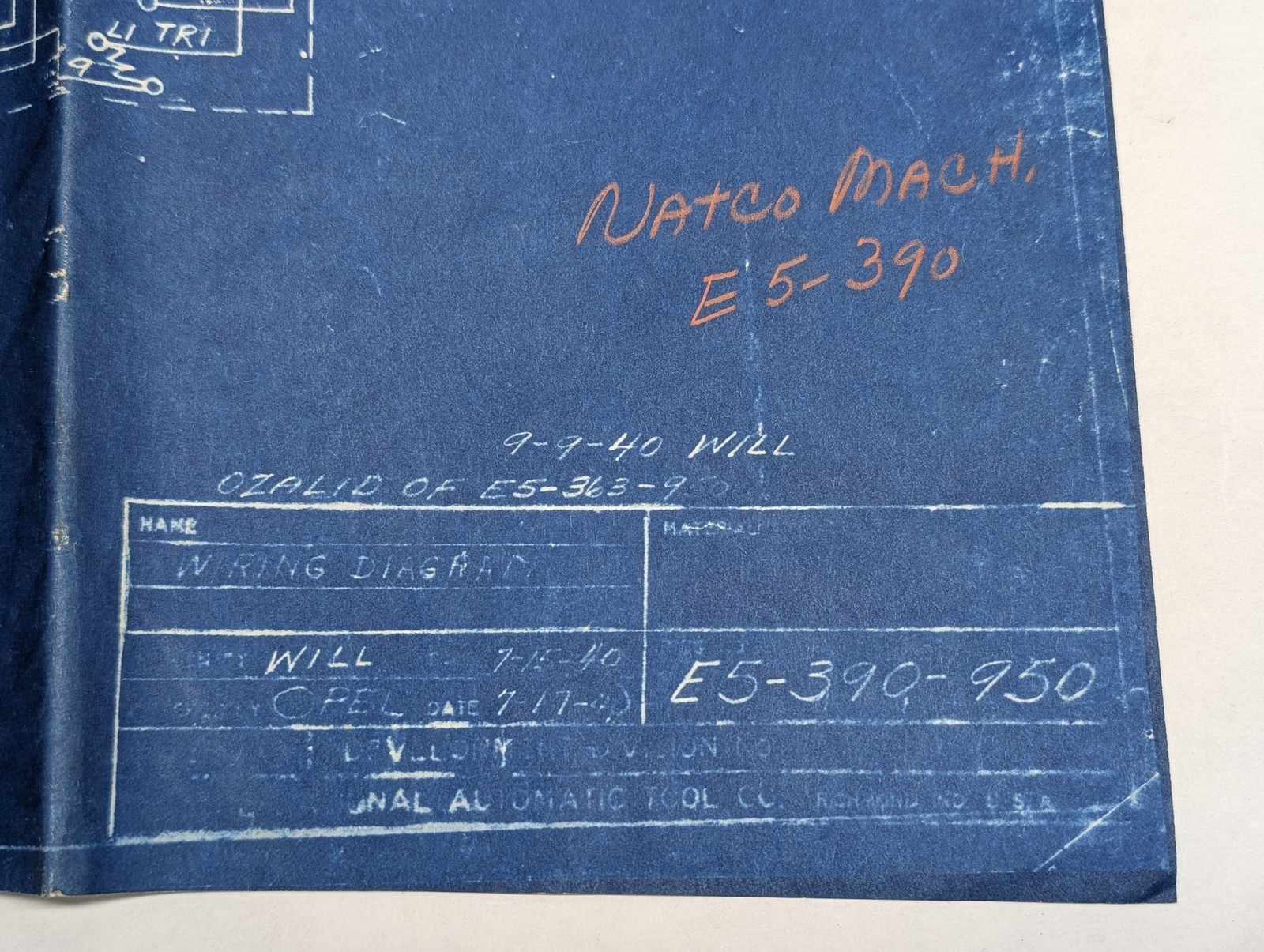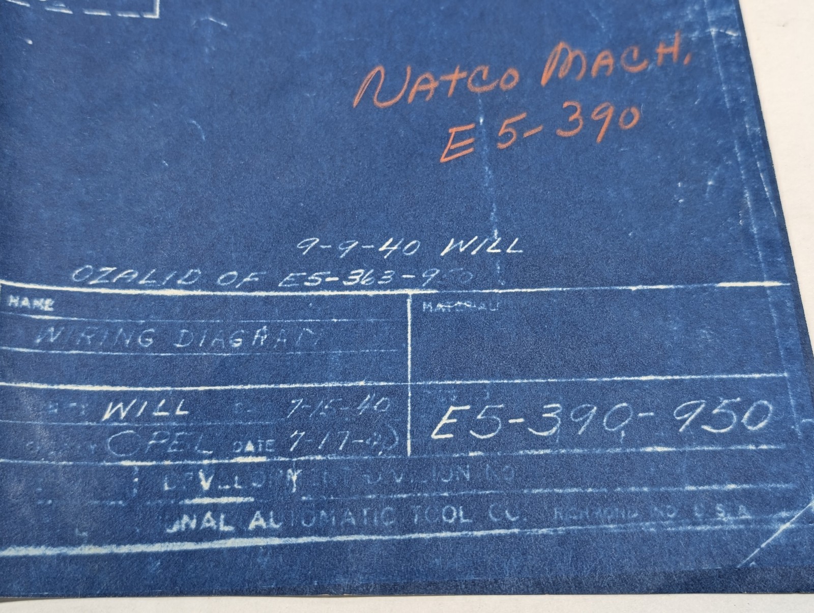 National Automatic Tool Wiring Diagram Machine E5-390 Drawing #E5-390-950 1940