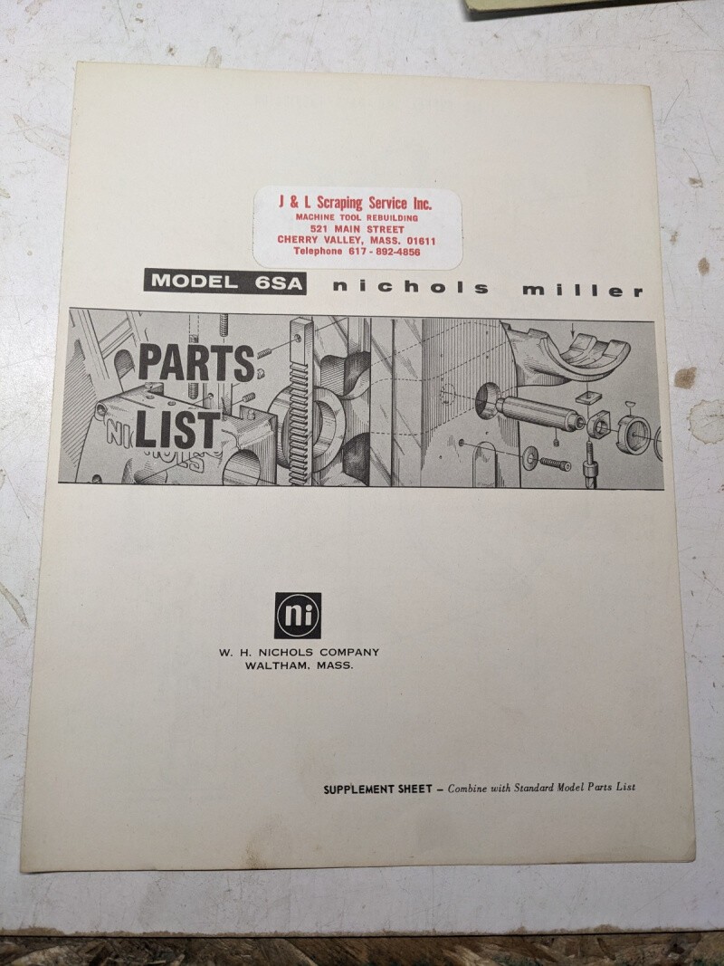 Nichols Milling Machine Tool Service Repair Parts List Book Manual Model 6Sa