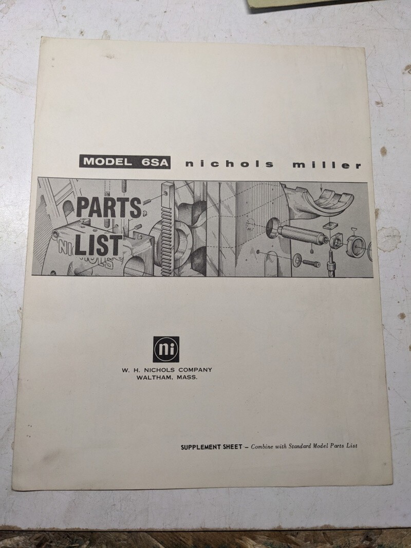 Nichols Milling Machine Tool Service Repair Parts List Book Manual Model 6Sa