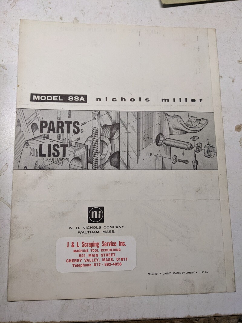 Nichols Milling Machine Tool Service Repair Parts List Book Manual Model 8Sa