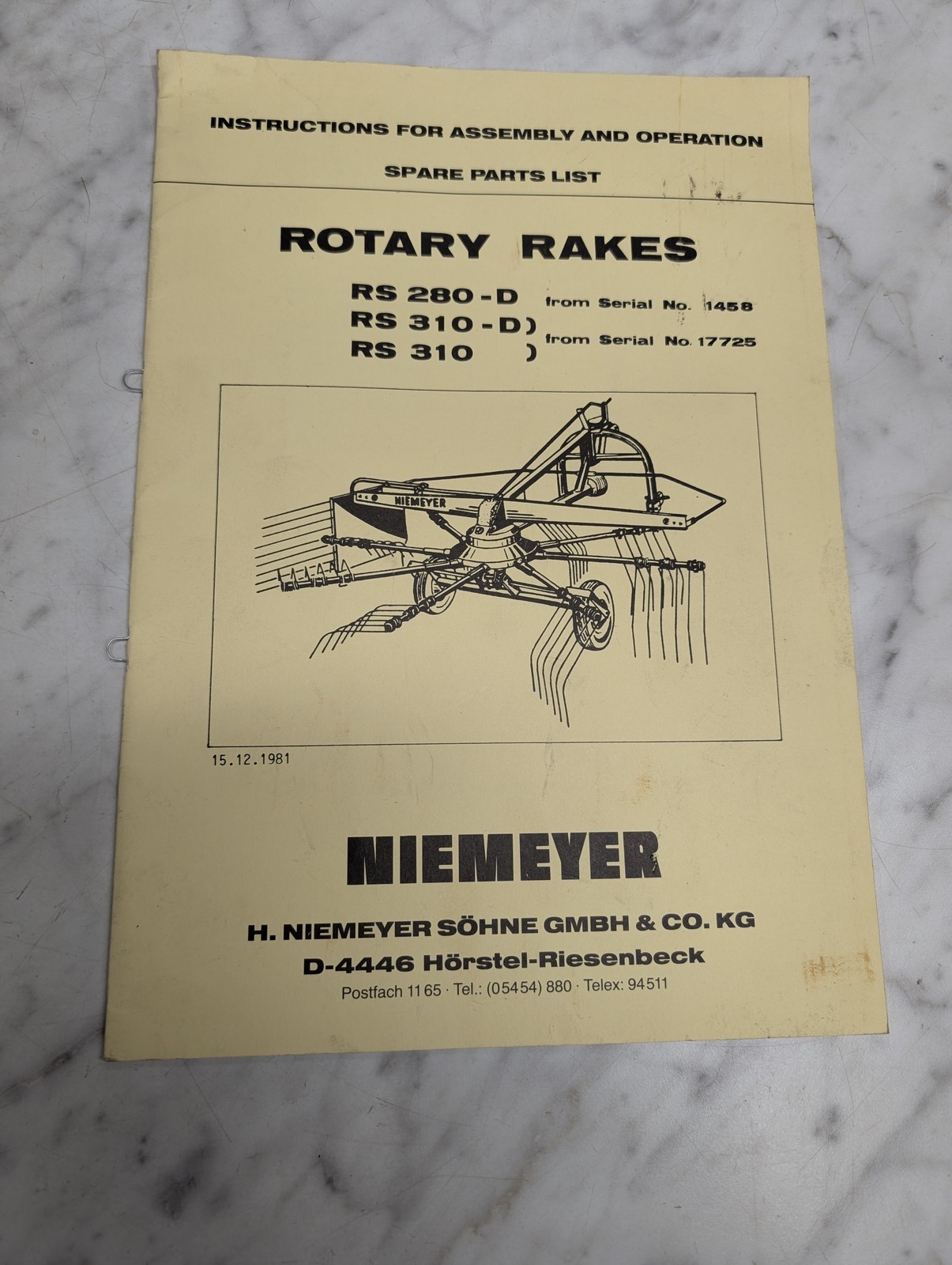 Niemeyer Rotary Rakes Rs 280-D 310-D Instruction Manual Parts List Catalog 1981