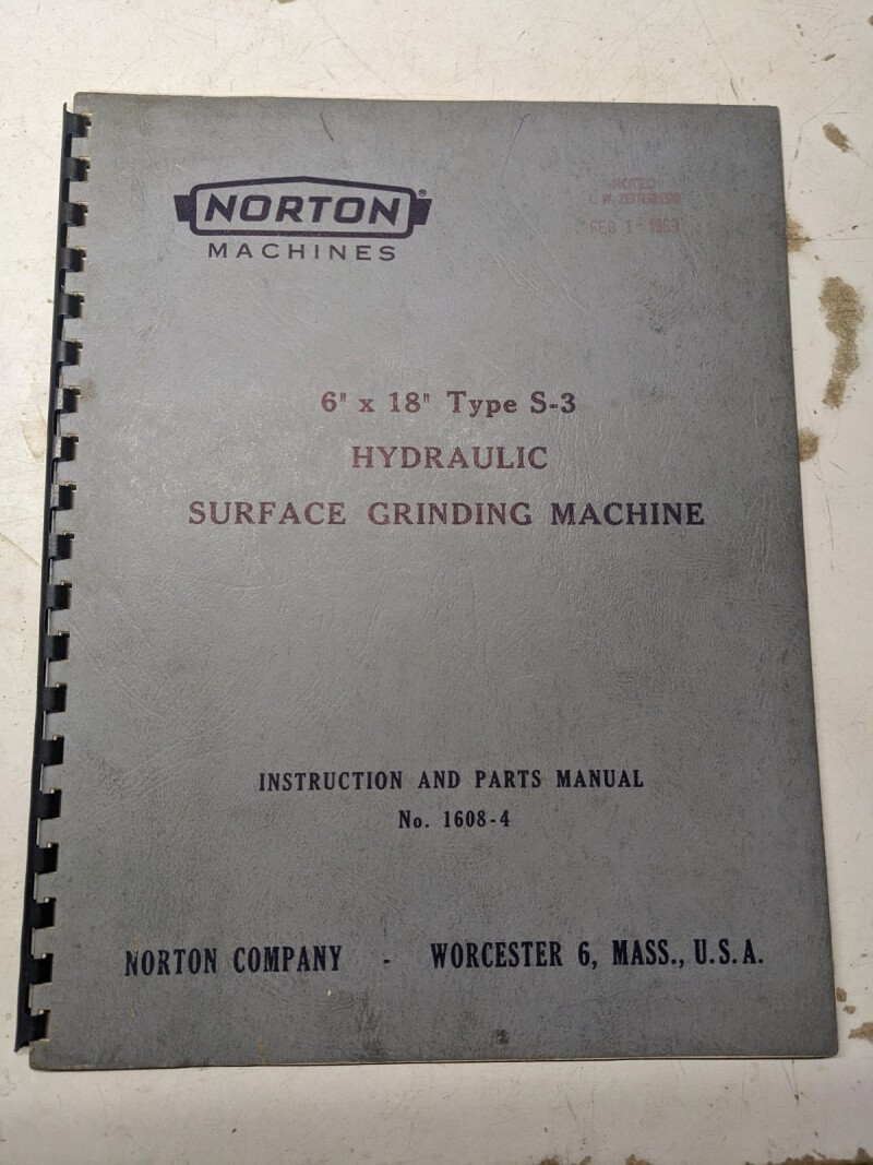 Norton Operator Service Manual Parts List 6X18” S-3 Type Surface Grinder 1608-4