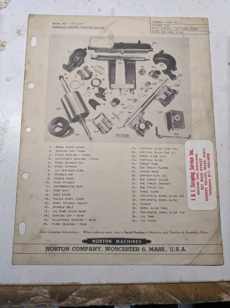 Norton Surface Grinder Macine Model 151 6X10” Assembly Sheet Part List 1943 Book