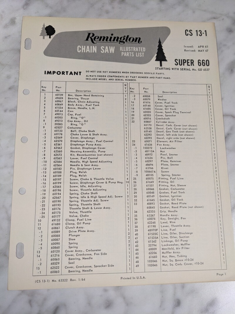 Oem Remington Illustrated Parts List Manual Chain Saw Cs-13-1 1967 Super 660 Gd
