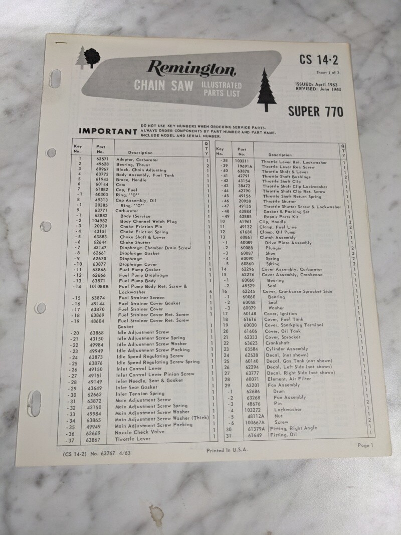 Oem Remington Illustrated Parts List Manual Chain Saw Cs-14-2 1963 Super 770