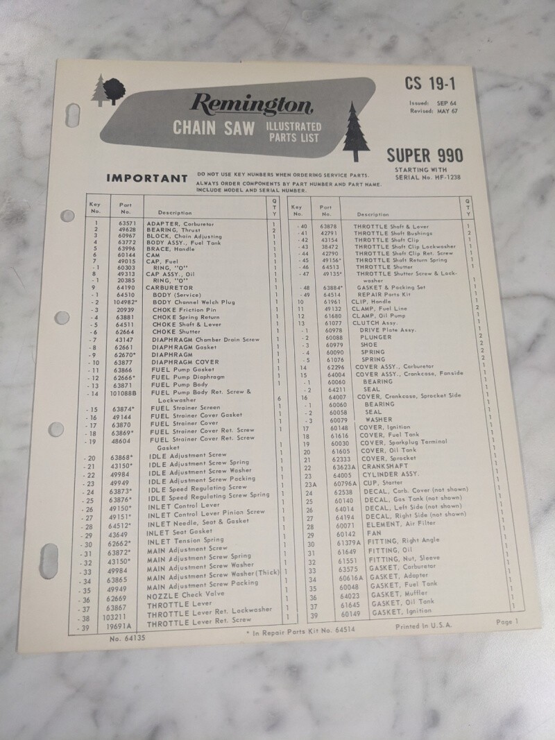 Oem Remington Illustrated Parts List Manual Chain Saw Cs 19-1 Super 990 1967 Hf