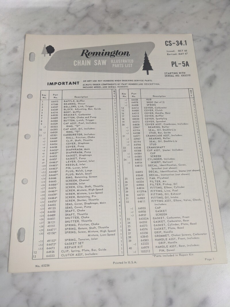Oem Remington Illustrated Parts List Manual Chain Saw Cs-34.1 1967 Pl-5A Kk