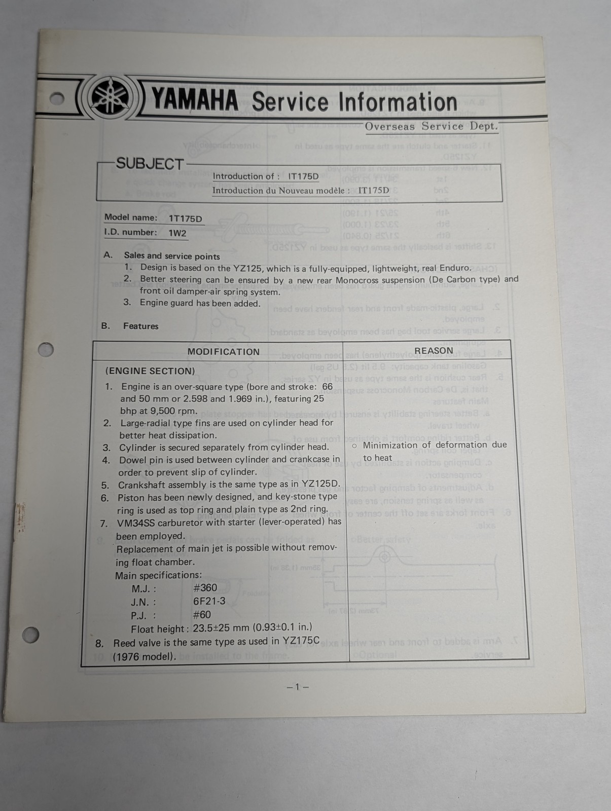 Oem Yamaha 1T175D Service Information Sheets Motorcycle Model Updates
