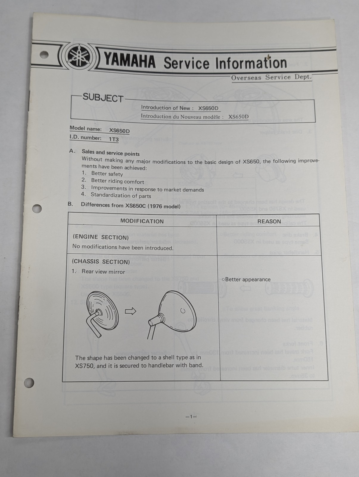 Oem Yamaha Xs650D Service Information Sheets Motorcycle Model Updates