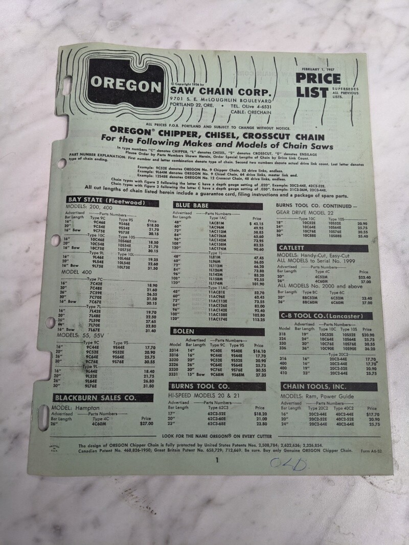 Oregon Retailer Parts Price List Catalog Sales Literature Catalog 1957