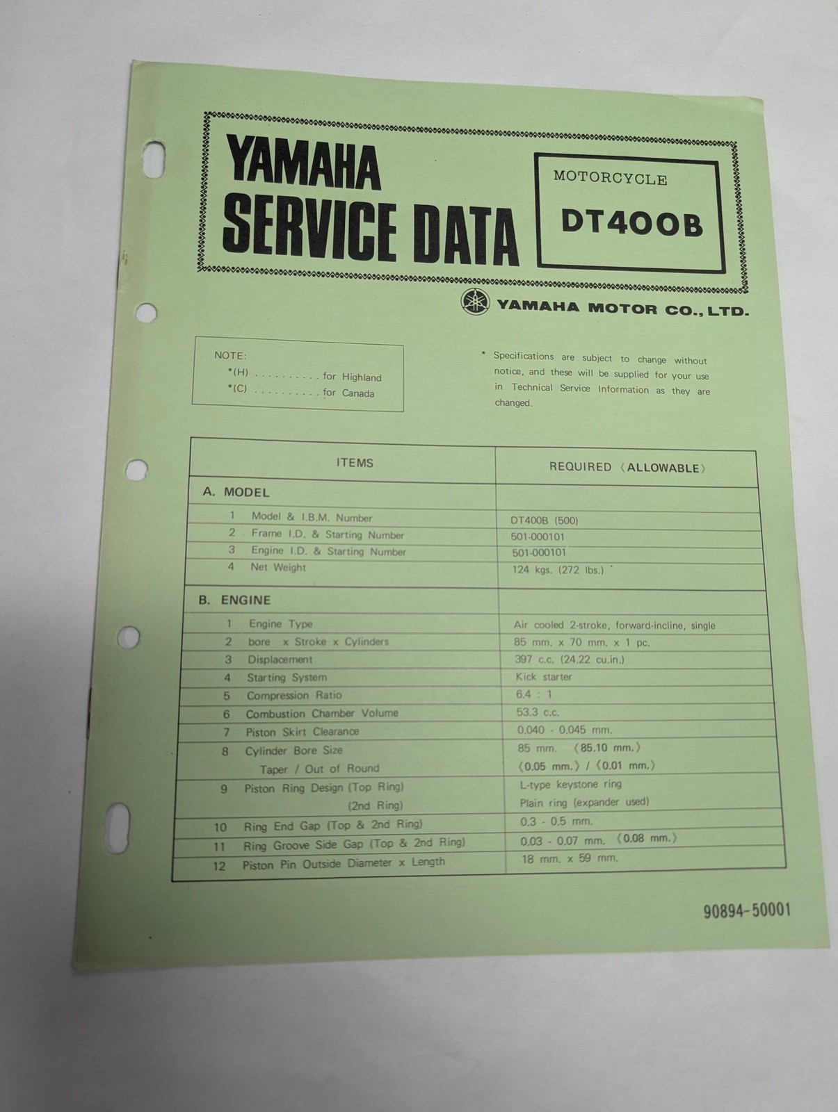 Original Oem Yamaha Service Data Sheets Motorcycle Specifications Dt400B
