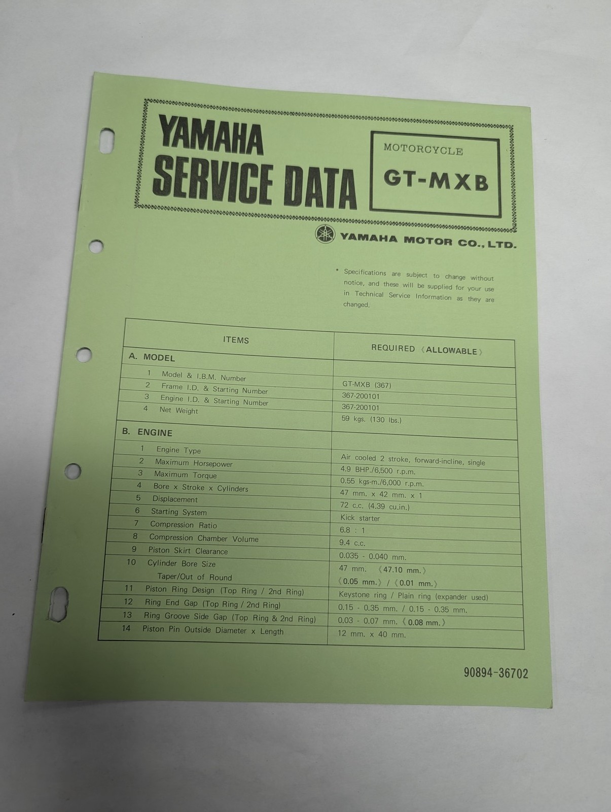 Original Oem Yamaha Service Data Sheets Motorcycle Specifications Gt-Mxb