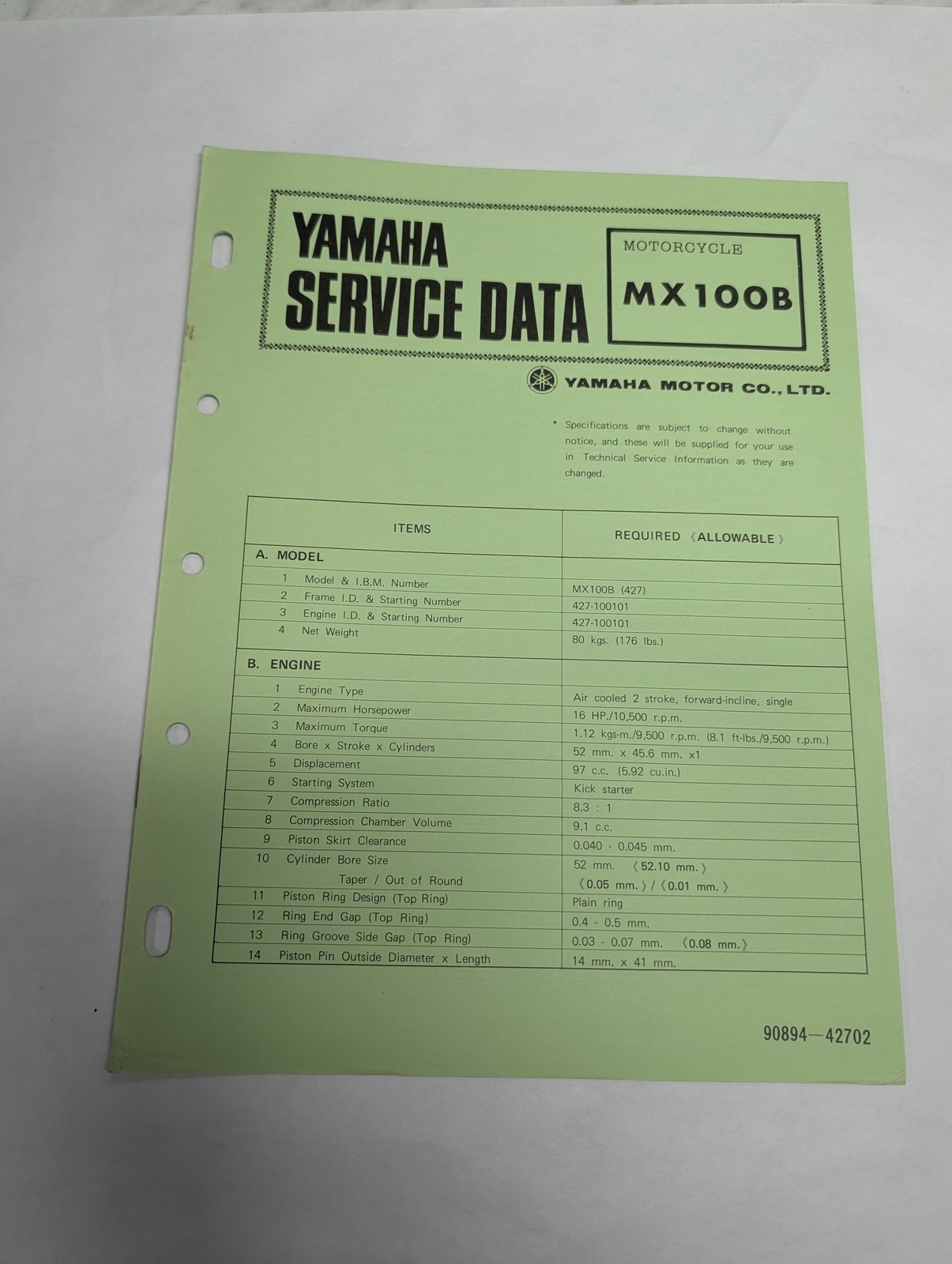 Original Oem Yamaha Service Data Sheets Motorcycle Specifications Mx100B