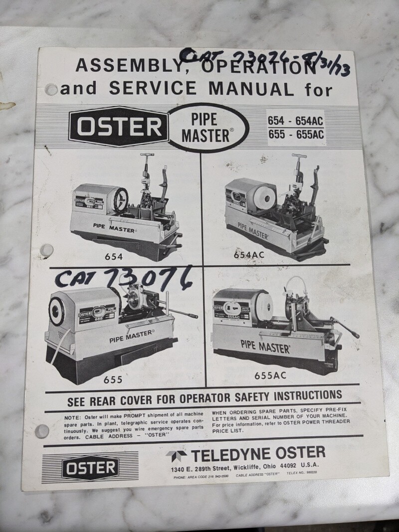 Oster Pipe Master Assembly Operator Service Manual Parts List 654Ac 655 Teledyne