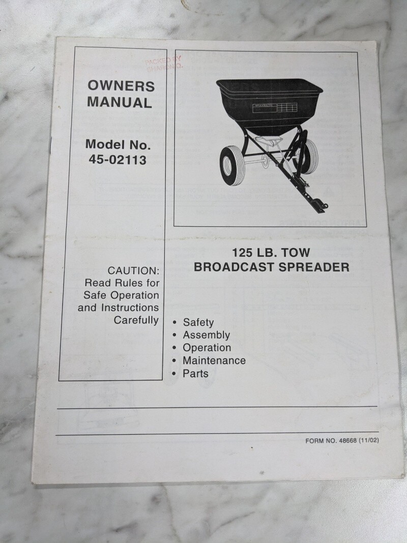 Owners Manual 125 Lb Tow Broadcast Spreader Parts List 48668 2002 45-02113