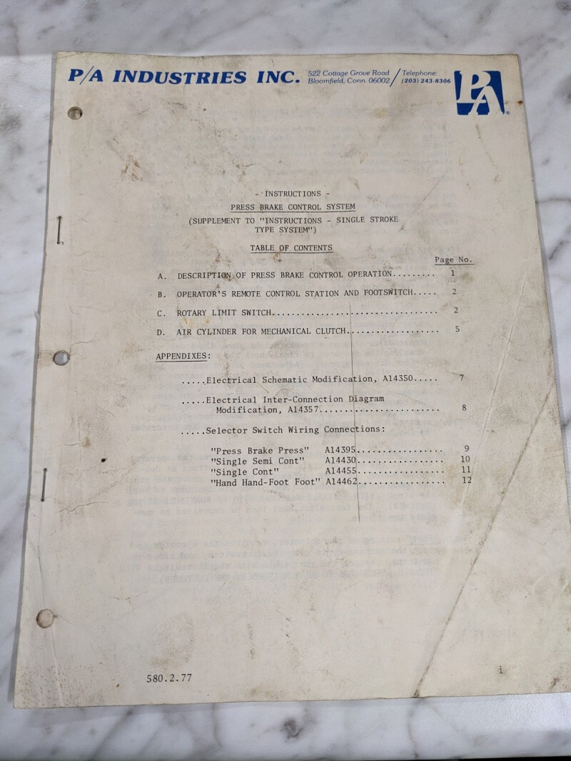 P/A Press Brake Control System Supplement Manual Book Single Stroke Type