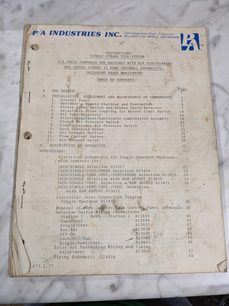 P/A Press Controls Air Clutch/Brake Single Stroke Type Instruction Manual Book