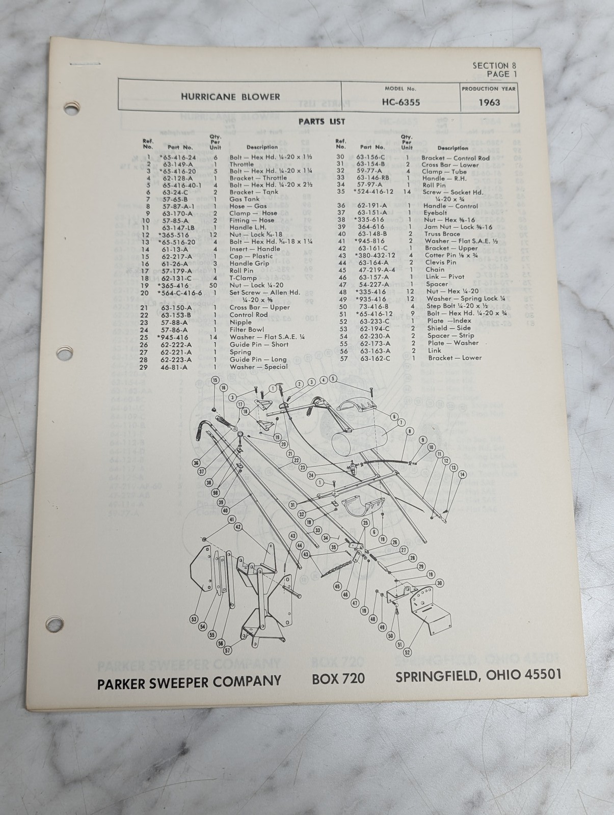 Parker Sweeper Hurricane Blower Hc-6355 Parts List 1963 Section 8 Parts List