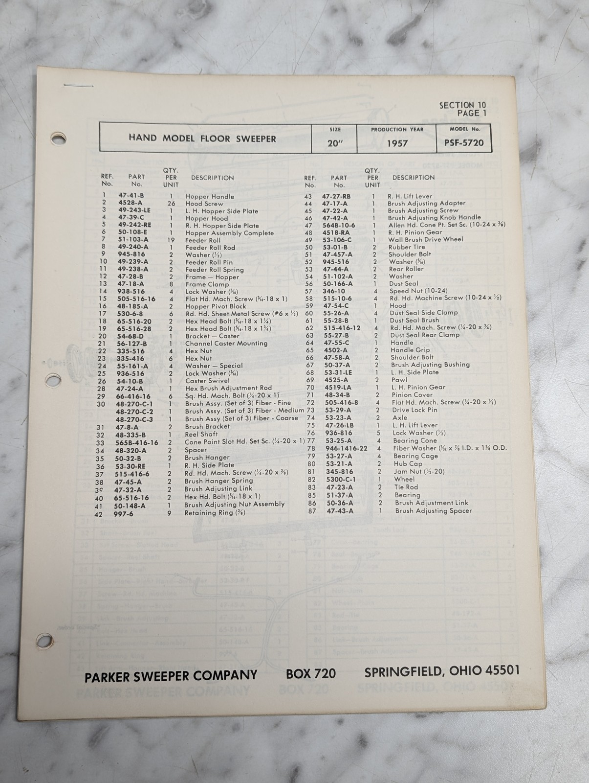 Parker Sweeper Psf 5720 Hand Model Floor 1957 Section 10 Parts List