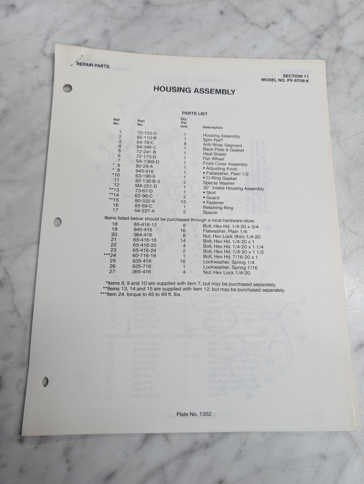 Parker Sweeper Repair Parts List Sheets Catalog Model Pv-8708-K