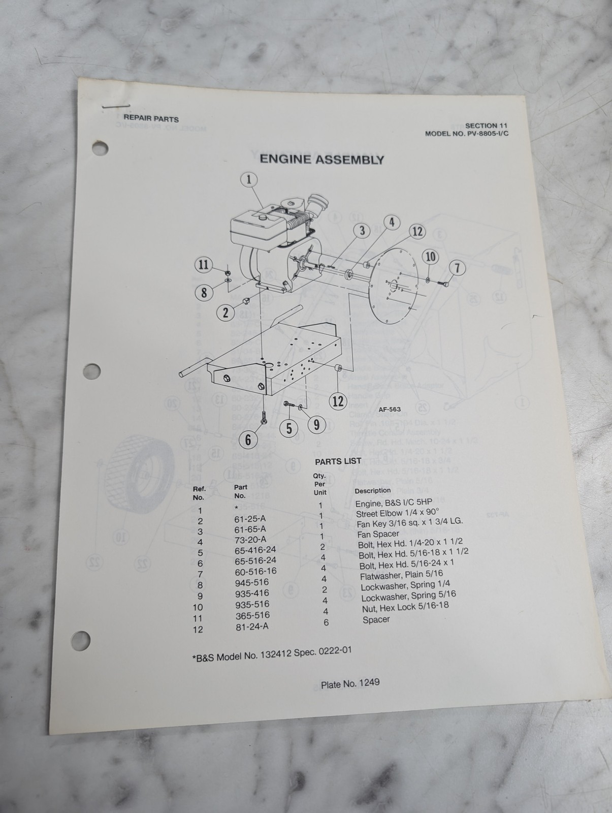 Parker Sweeper Repair Parts List Sheets Catalog Model Pv-8805-I/C