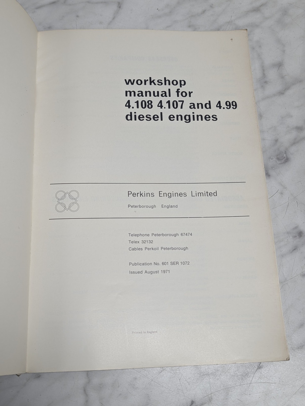 Perkins Engines 4.108 4.107 4.99 Diesel Workshop Service Manual 601 Ser 1072
