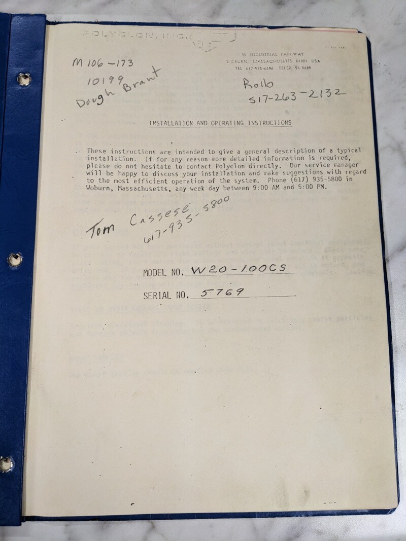 Polycon Inv Installation Operator Service Manual Model W20-100Cs Filtration 5769