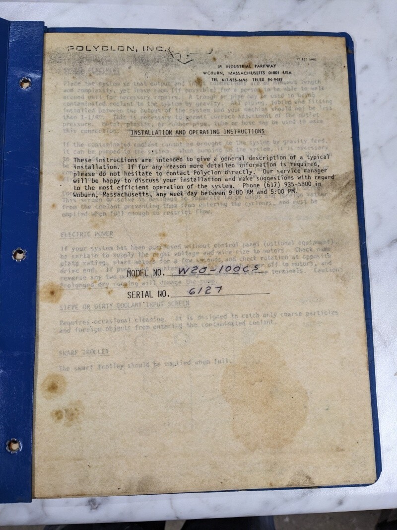 Polycon Inv Installation Operator Service Manual Model W20-100Cs Filtration Sys