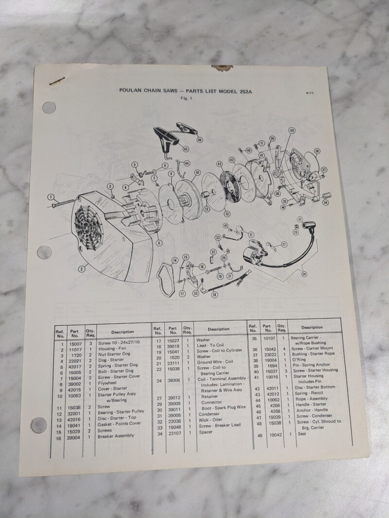 Poulan Illustrated Chain Saws Service Parts List Manual Catalog Model 252A 1971