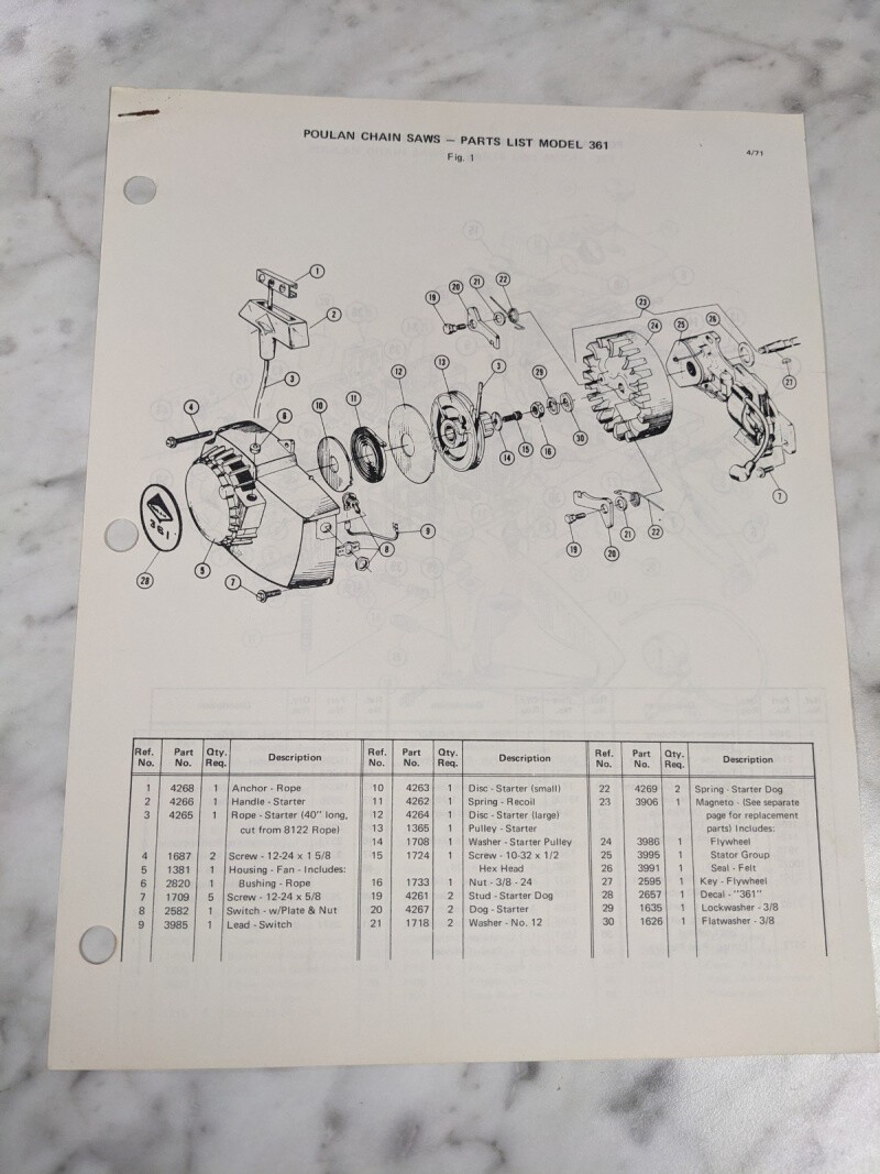 Poulan Illustrated Chain Saws Service Parts Manual List Catalog Model 361 1971