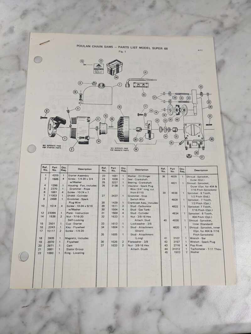 Poulan Illustrated Chainsaw Service Part List Manual Catalog Model Super 68 1971