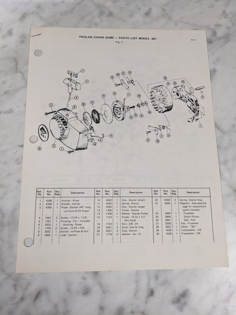 Poulan Illustrated Chainsaws Service Parts Manual List Catalog Model 361 1971